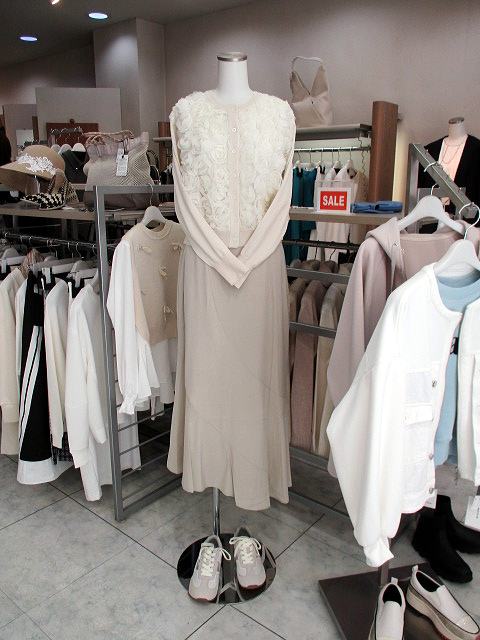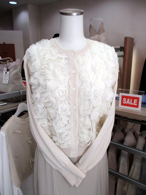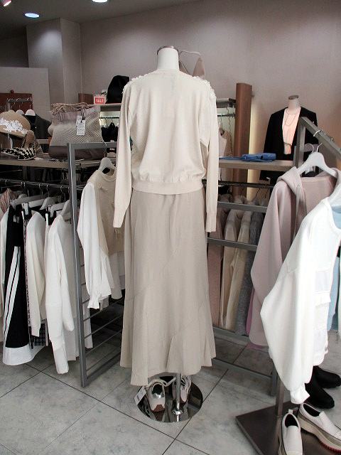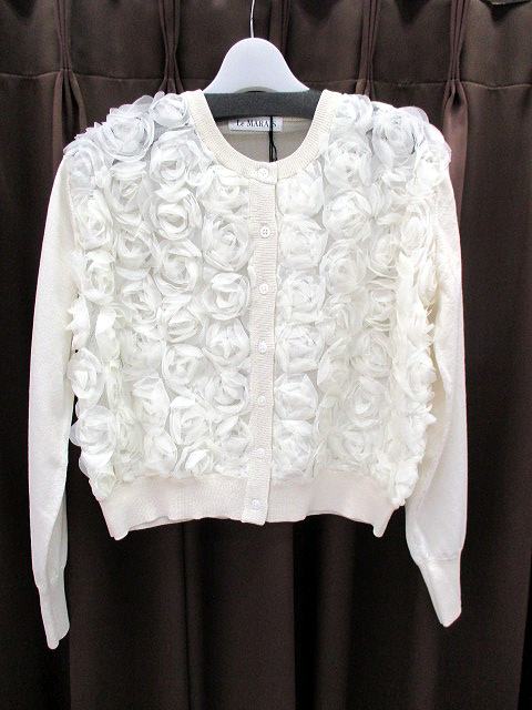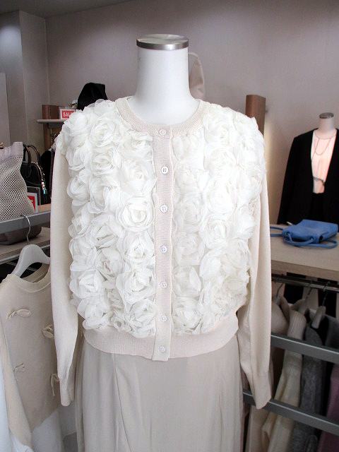 少し短めのベーシックな丸首ニットカーデの前面に、サークルカットしたチュールを貼り付けた存在感のあるカーディガンは着るだけで華やかな印象に。