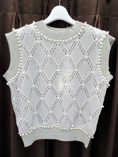 透かし模様のアーガイル柄レースに散りばめられたたくさんのパール。淡いグレーが上品です。