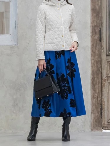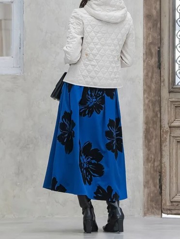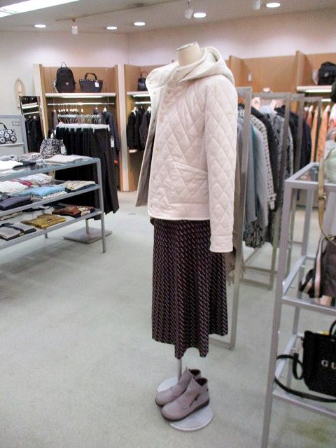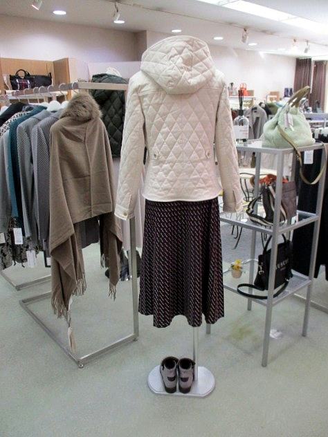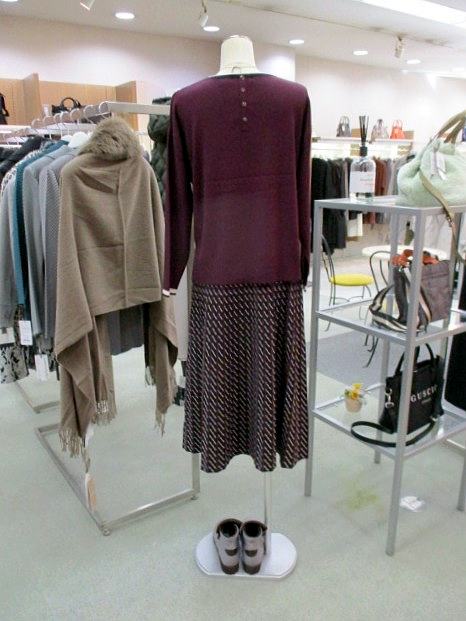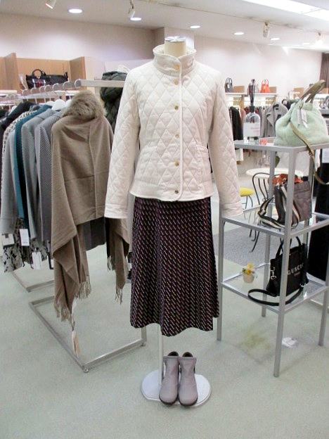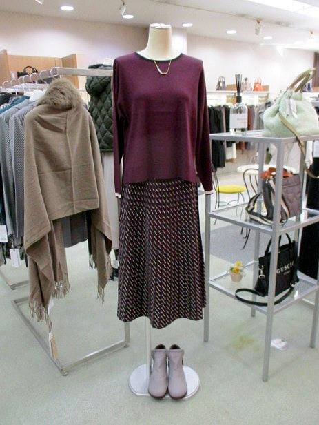 スカートは配色の幾何柄で、ディスプレーのニット以外ともコーディネイトしやすい色合いです。